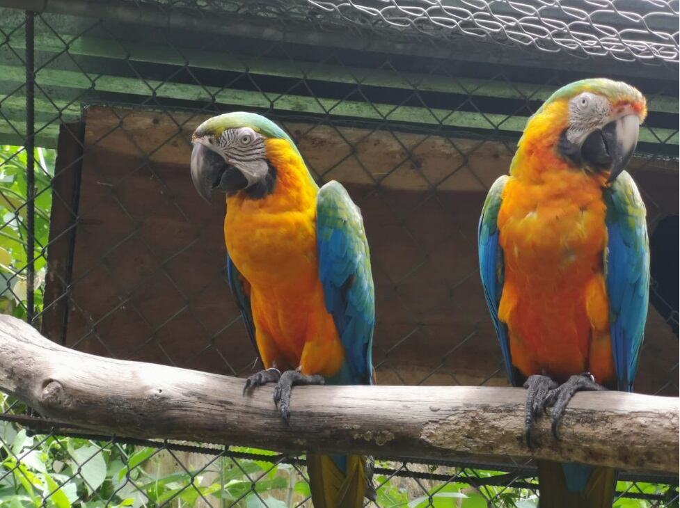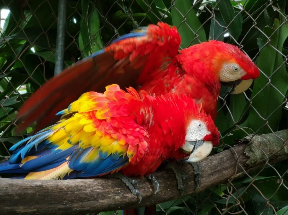 Se trata de dos lapas rojas oriundas de Costa Rica, que habitan en el centro de rescate Zoo Ave. Son dos machos, que no tienen nombre y que están en una zona de aislamiento para reproducción junto con otras aves.