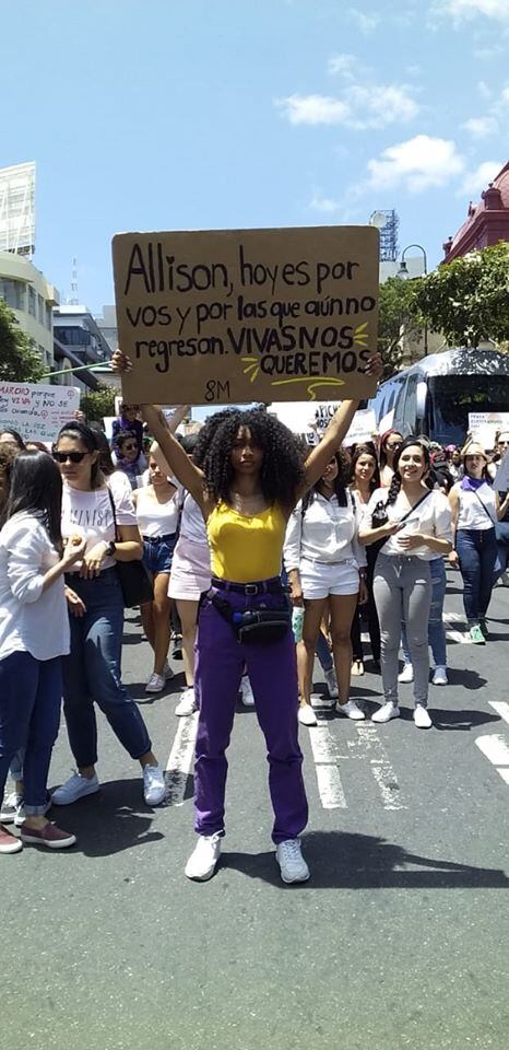 Así como ellas, decenas de personas, en su mayoría mujeres, llevaron mensajes en apoyo a aquellas mujeres que sufren violencia, que han muerto en manos de sus parejas y también marcharon por la joven Allison Bonilla, que está desaparecida desde el miércoles anterior.