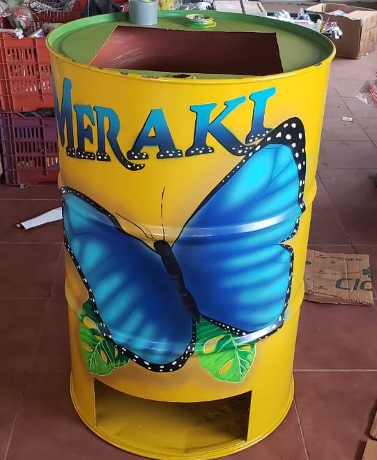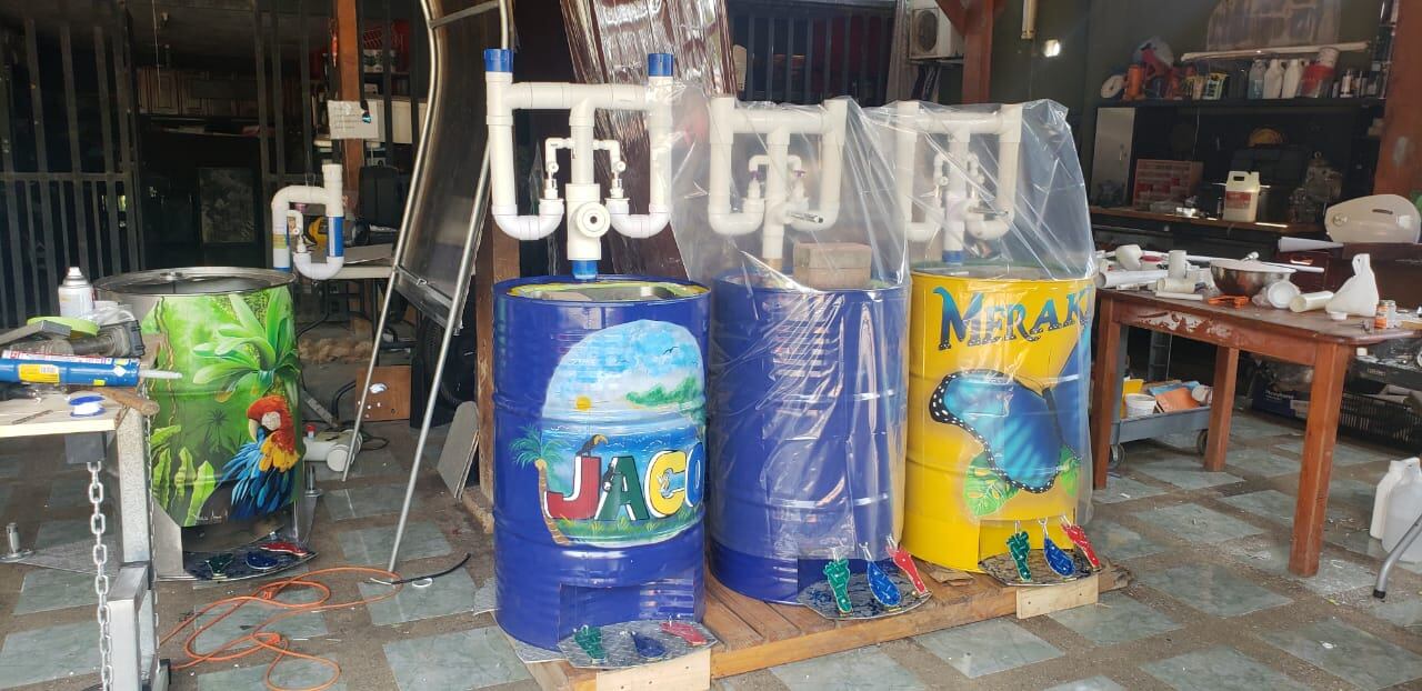 Los hace con dos materiales principales, tubos de PVC y estañones usados, los cuales acondiciona para que queden muy corrongos. Incluso, si el cliente así lo quiere, contrata a artistas para que los decoren con pinturas de mariposas, lapas y otras especies de esa linda zona del Pacífico.