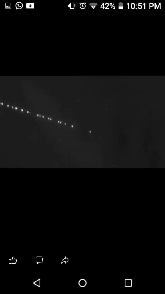 “Seguro se observó una parte de los satélites artificiales que están localizados en la órbita baja terrestre, lanzados por la empresa SpaceX. El propósito es dar comunicación satelital de alto rendimiento de Internet”, escribió en su respuesta.