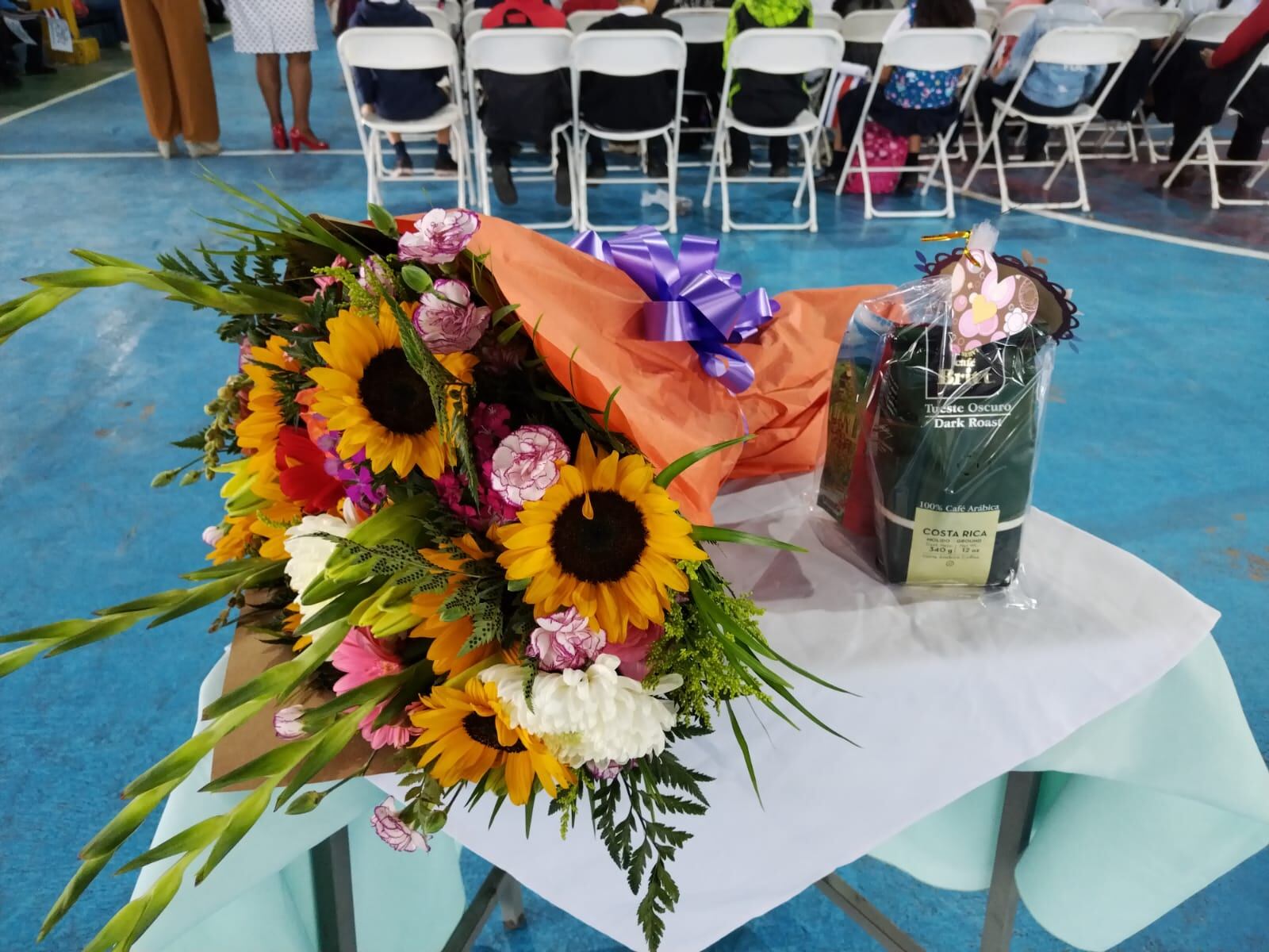 Le regalaron un precioso ramo de flores, café y un estudiante, Eithan Delgado, le hizo un regalito bien espacial para que se lo lleve a la NASA en donde él espera trabajar dentro de poco.