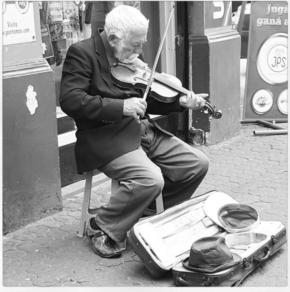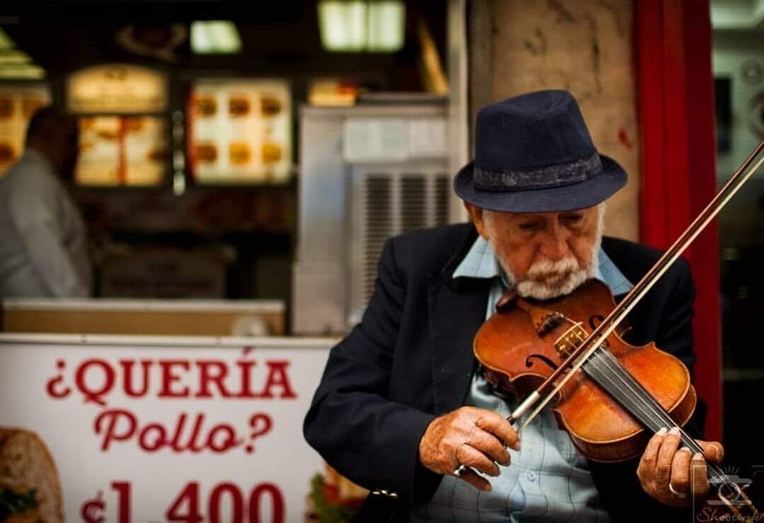 Justiniano Orozco tiene 85 años, todos los días llega a la avenida Central a eso de las 8 a. m. para alegrar el paso de cientos de transeúntes con su violín.