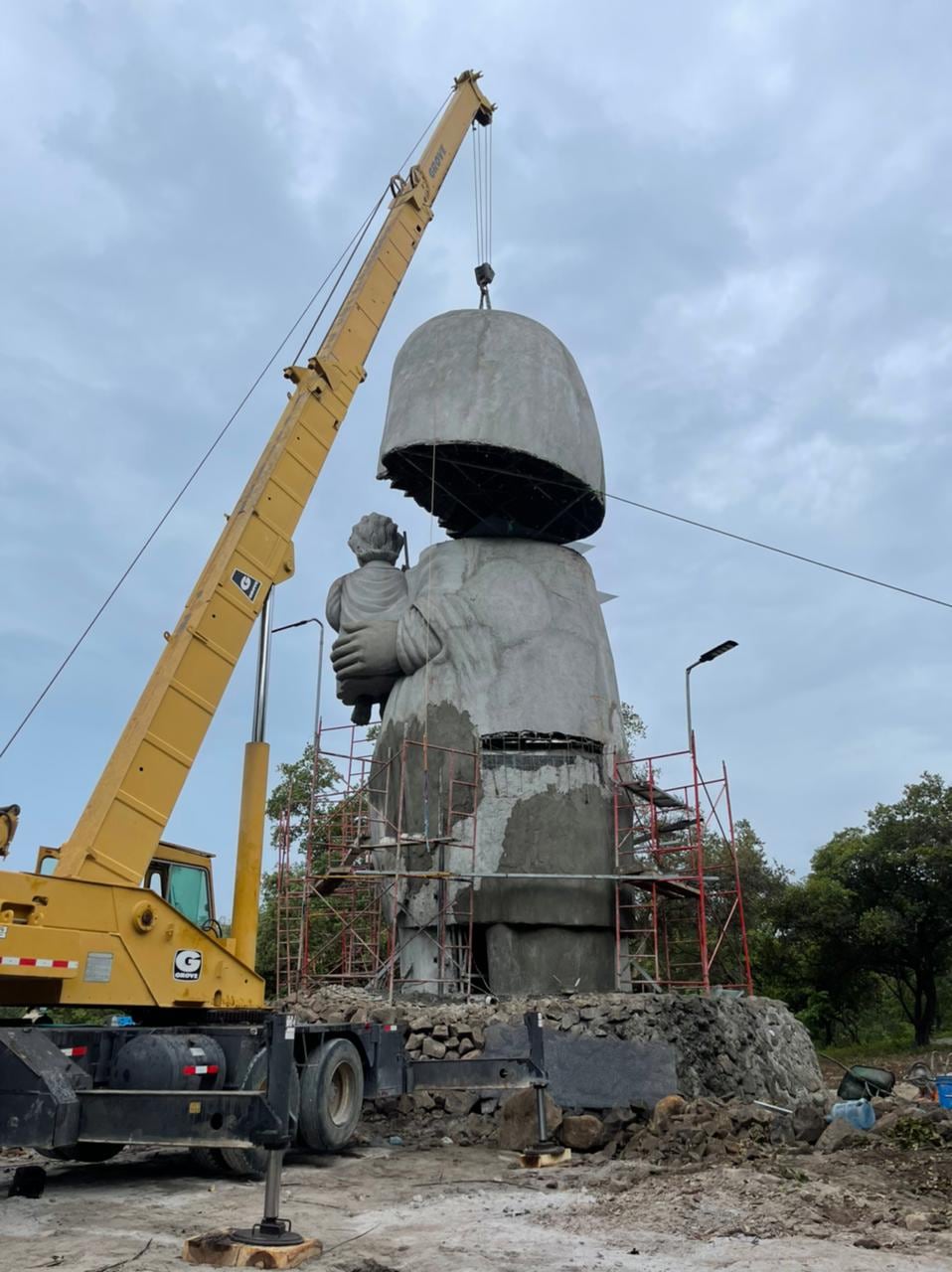 “La escultura se desarrolló en cuatro bloques de cuatro metros cada uno y en cuatro talleres diferentes se fue haciendo cada una, luego se fueron trasladando una a una para ir montando la figura”, contó el coordinador de la obra.
