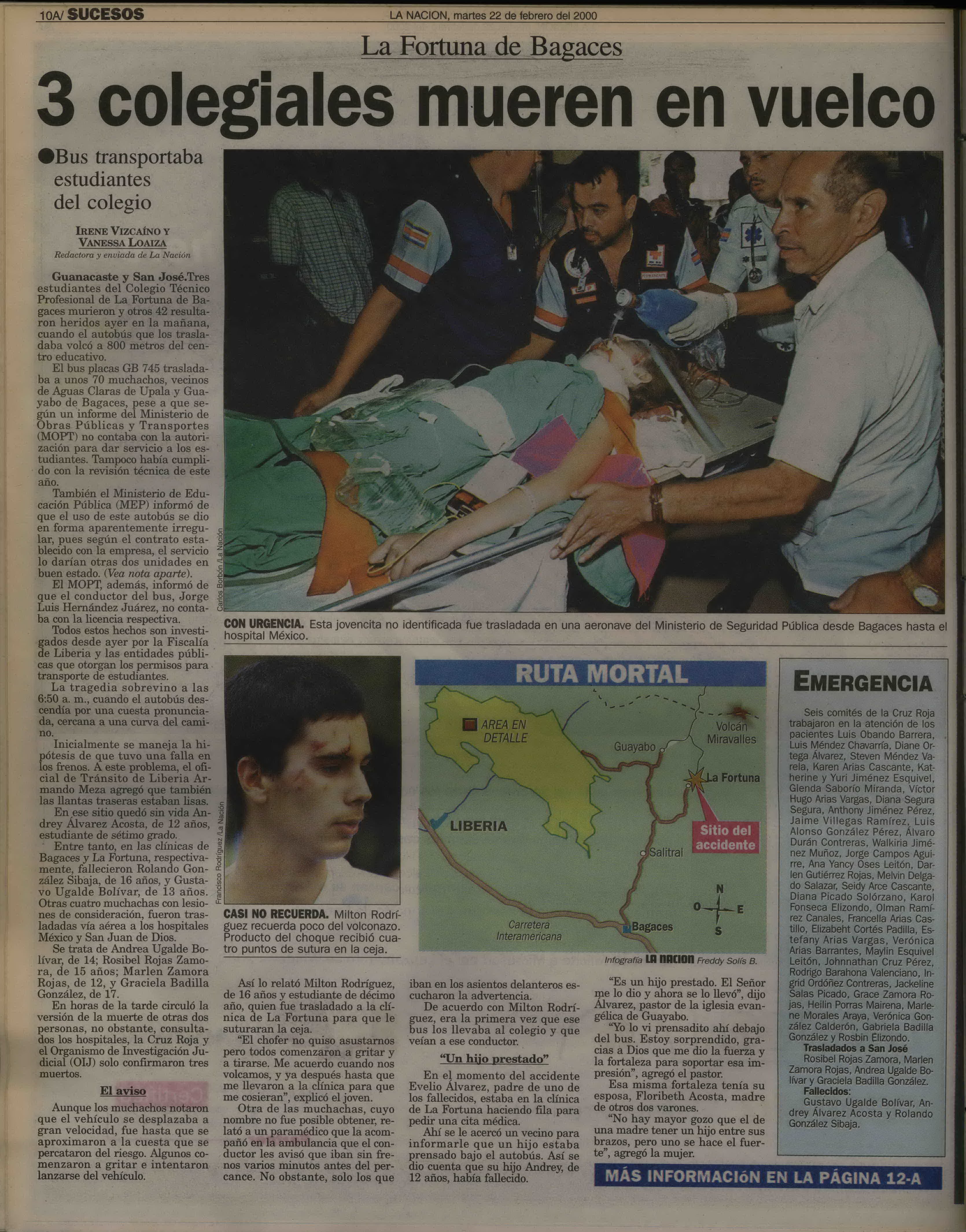 Aquel día, Rosibel –quien tenía 14 años– viajaba con otros 59 estudiantes en un bus contratado por el Ministerio de Educación Pública para el transporte de alumnos de zonas como Upala y Guayabo de Bagaces.