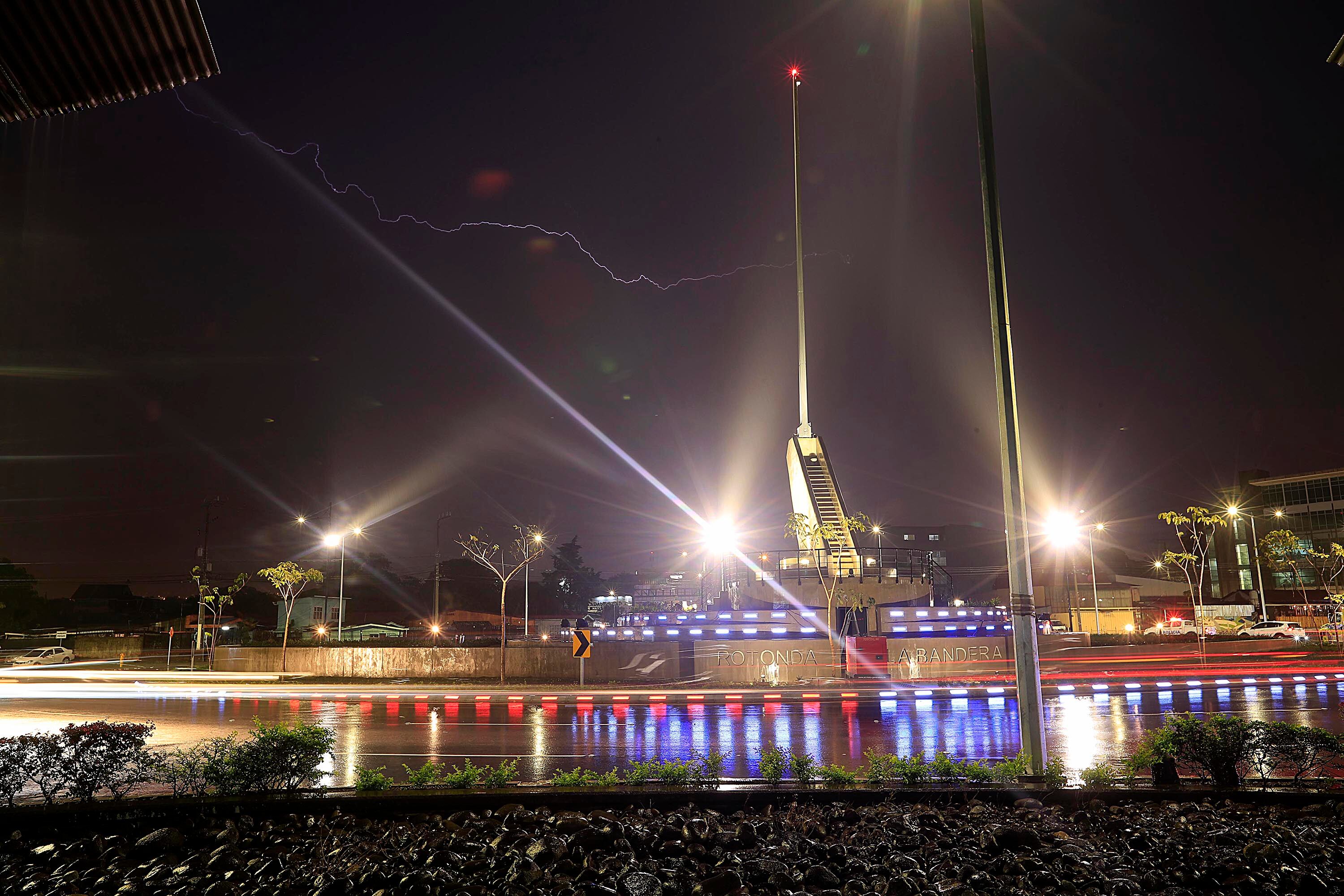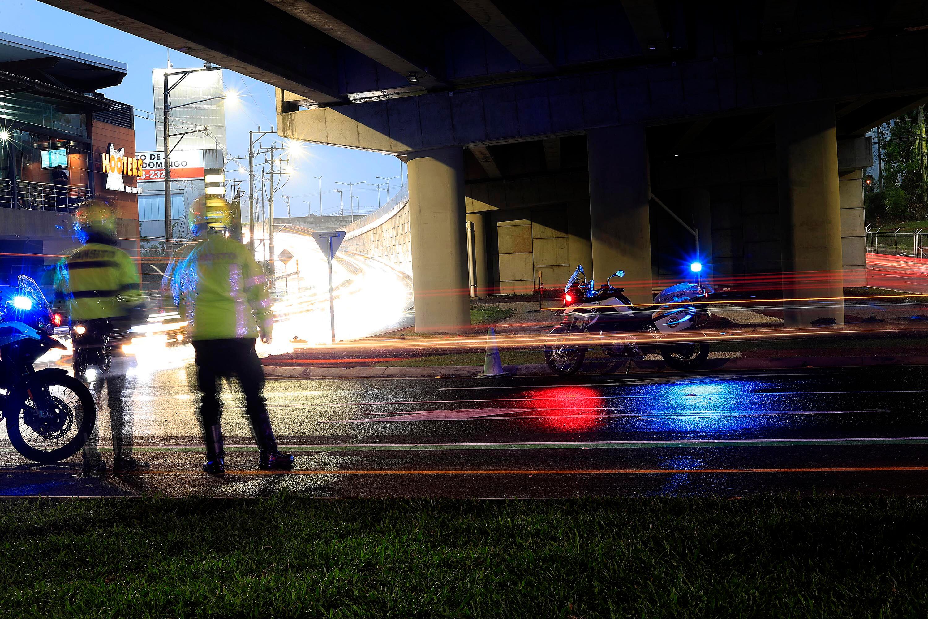 Un grupo de oficiales de la Policía de Tránsito fue el primero en transitar esta noche en el nuevo paso a desnivel en la rotonda la Bandera, tras ser inaugurado por el presidente de la República, Carlos Alvarado.