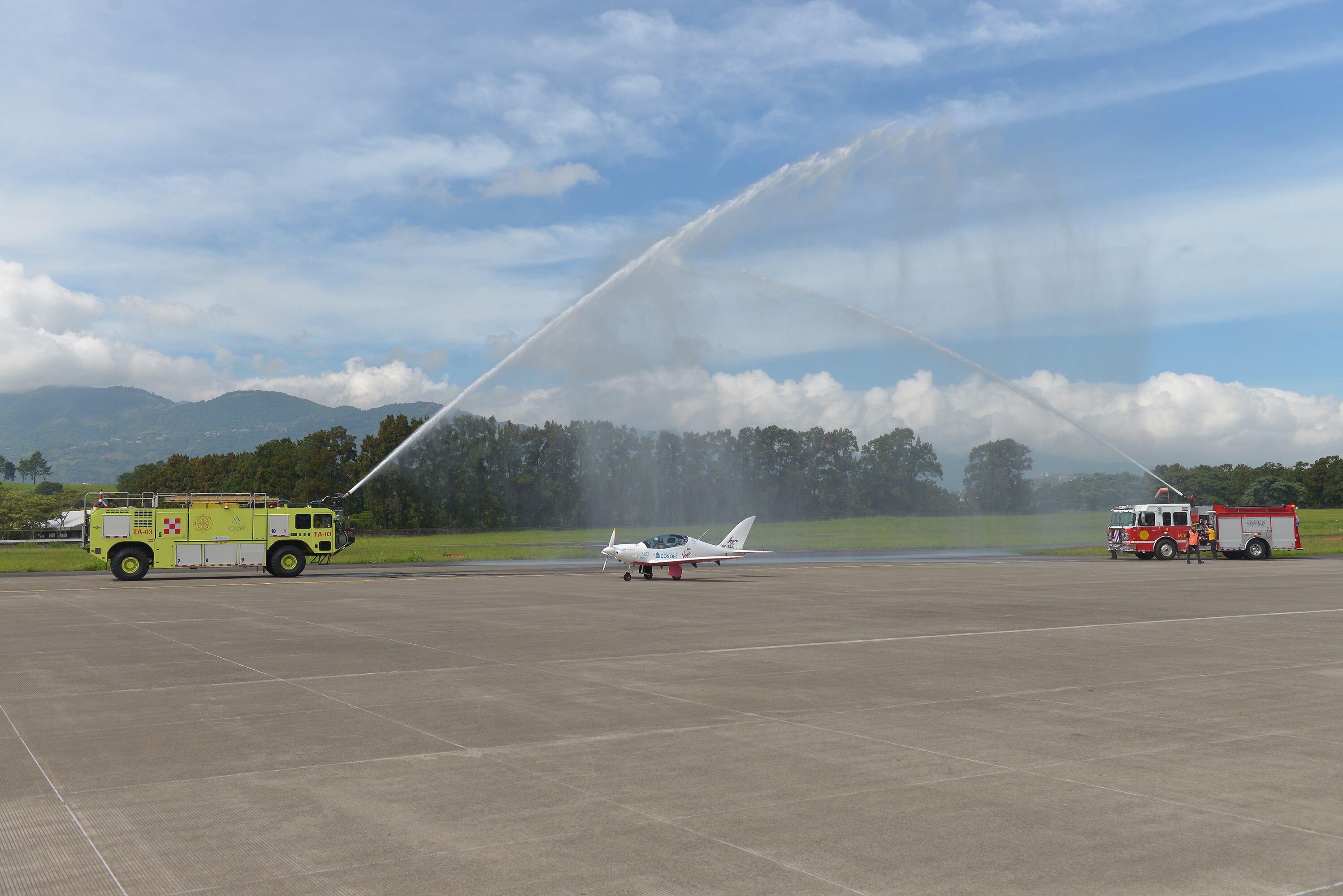 Fueron dos muy movidas horas las que estuvo la aviadora en suelo costarricense. No salió del Tobías Bolaños, eso sí, estuvo rodeada de pilotos, estudiantes de aviación, una niña, prensa y empresarios del mundo aeronáutico que la aplaudieron y felicitaron.