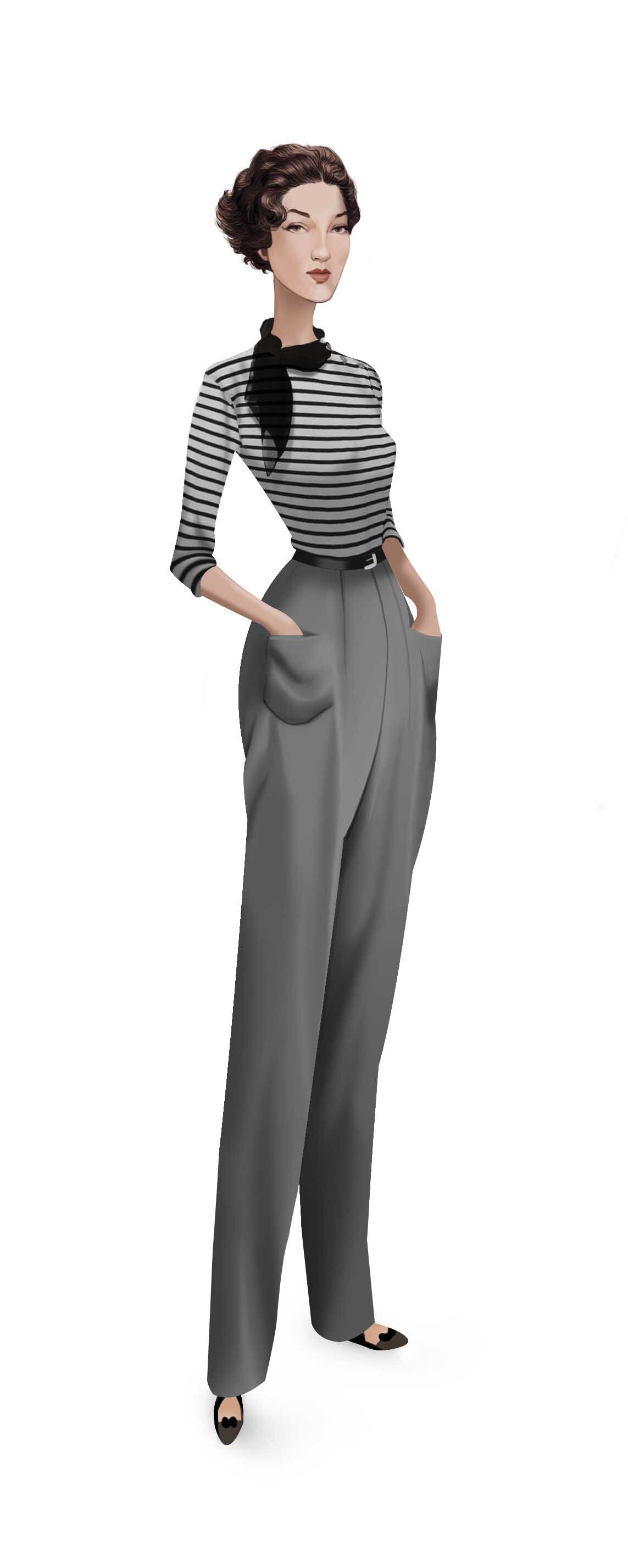 Pantalones con un paletón adelante y usados hasta la cintura fueron el hito de esta época. La influencia viene de Estados Unidos, ya que después de la Segunda Guerra Mundial este país empieza a imponer sus tendencias en la moda. Mientras tanto, Europa necesitaba recuperarse de seis años de conflicto.