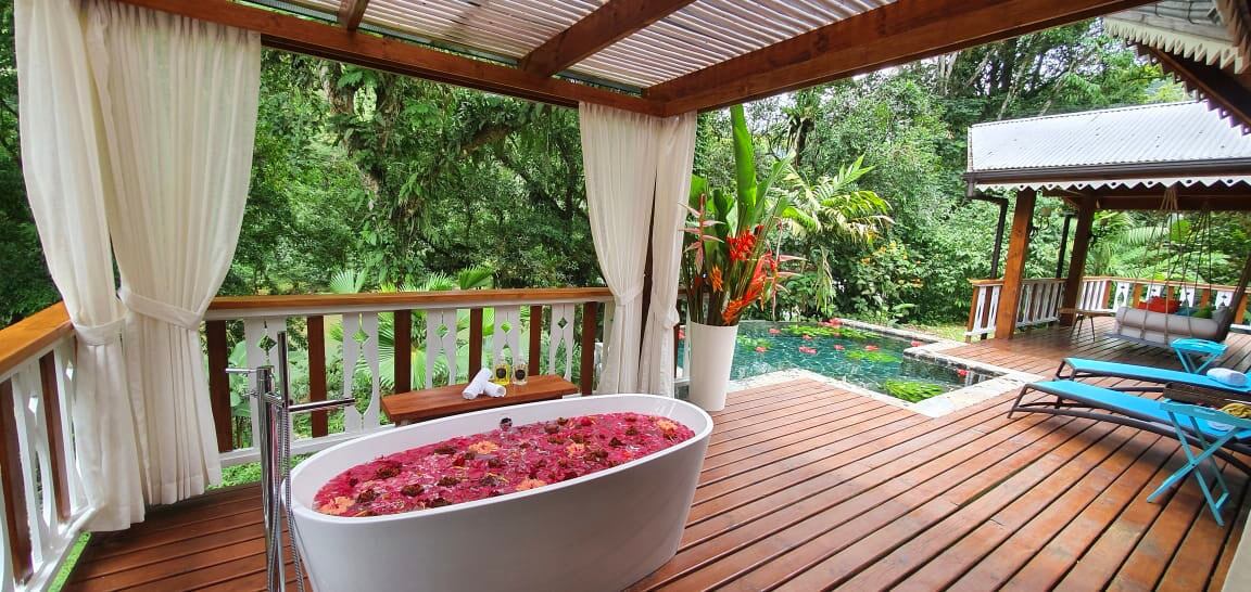 En la Honeymoon Suite, la belleza natural del exótico bosque tropical es el complemento perfecto para una escena llena de magia y pasión. La suite es amplia y encantadora, posee una cama king con dosel y jacuzzi en la habitación.