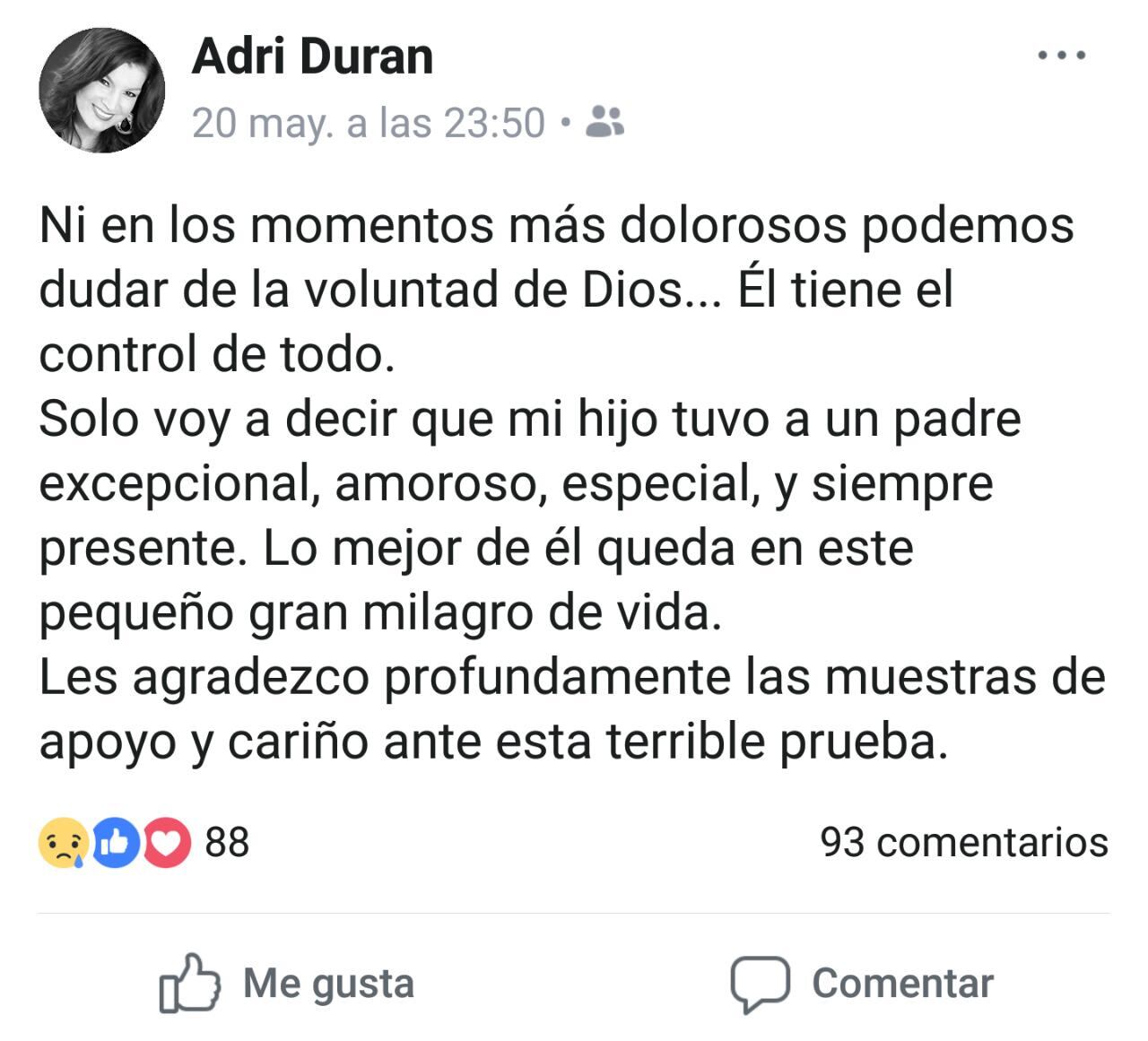 “Solo voy a decir que mi hijo tuvo a un padre excepcional, amoroso, especial, y siempre presente. Lo mejor de él queda en este pequeño gran milagro de vida”, escribió Durán en su perfil de Facebook.