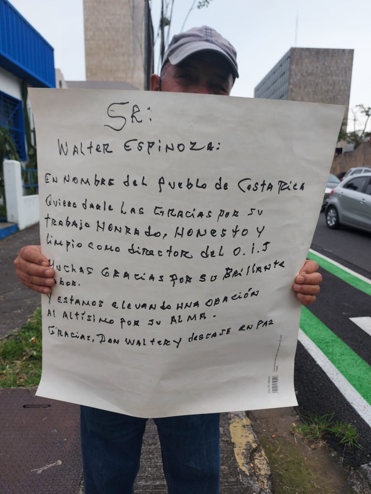 “En nombre del pueblo de Costa Rica, quiero darle las gracias por su trabajo honrado, honesto y limpio como director del OIJ. Muchas gracias por su brillante labor, estemos elevando una oración al altísimo por su alma, gracias don Wálter y descanse en paz”, decía el cartel.