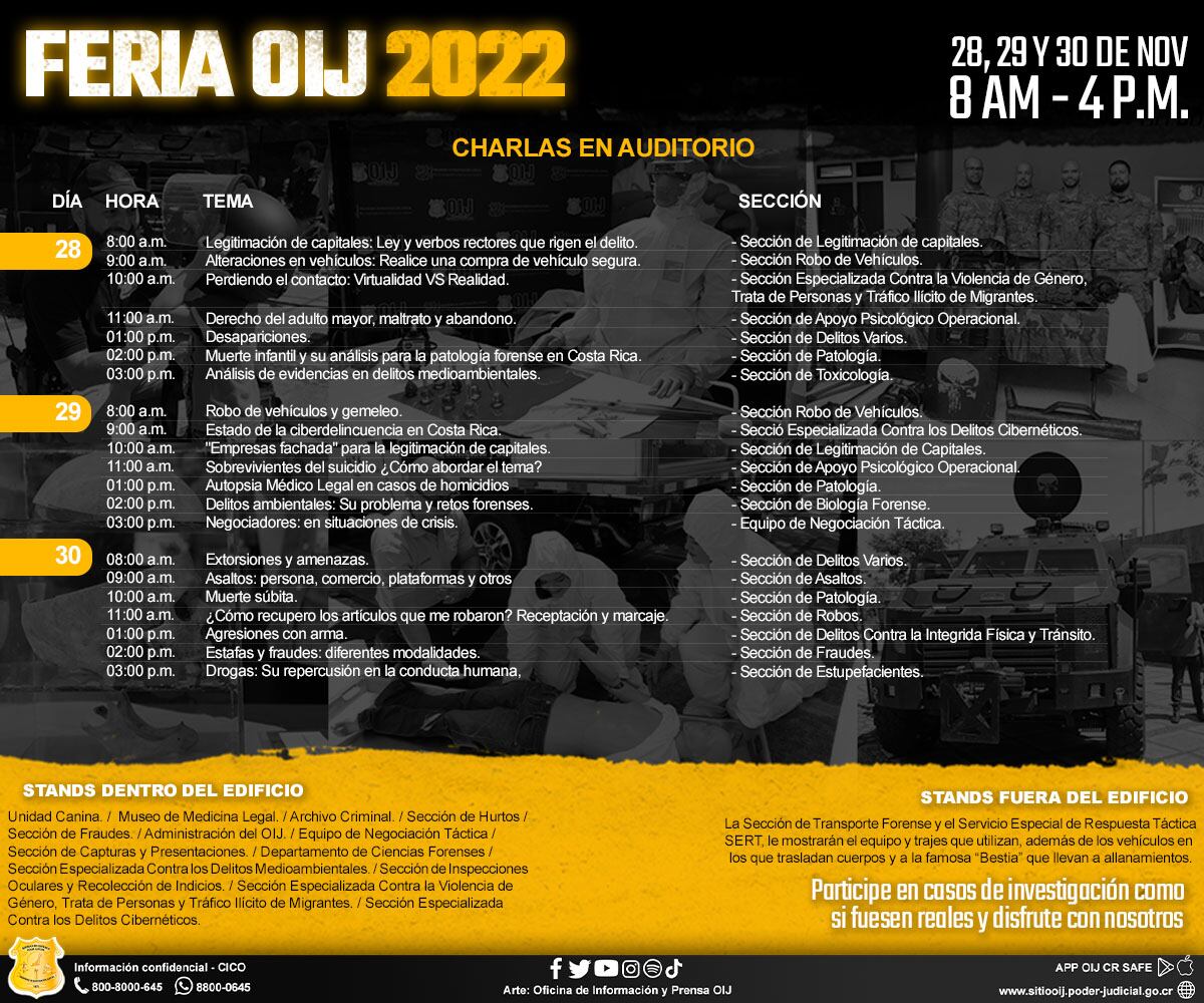 La feria se realiza en el edificio del OIJ en San José, en el auditorio cada hora hay una charla distinta y en el primer piso hay mesas donde las personas pueden hacer todas las preguntas que quieran.