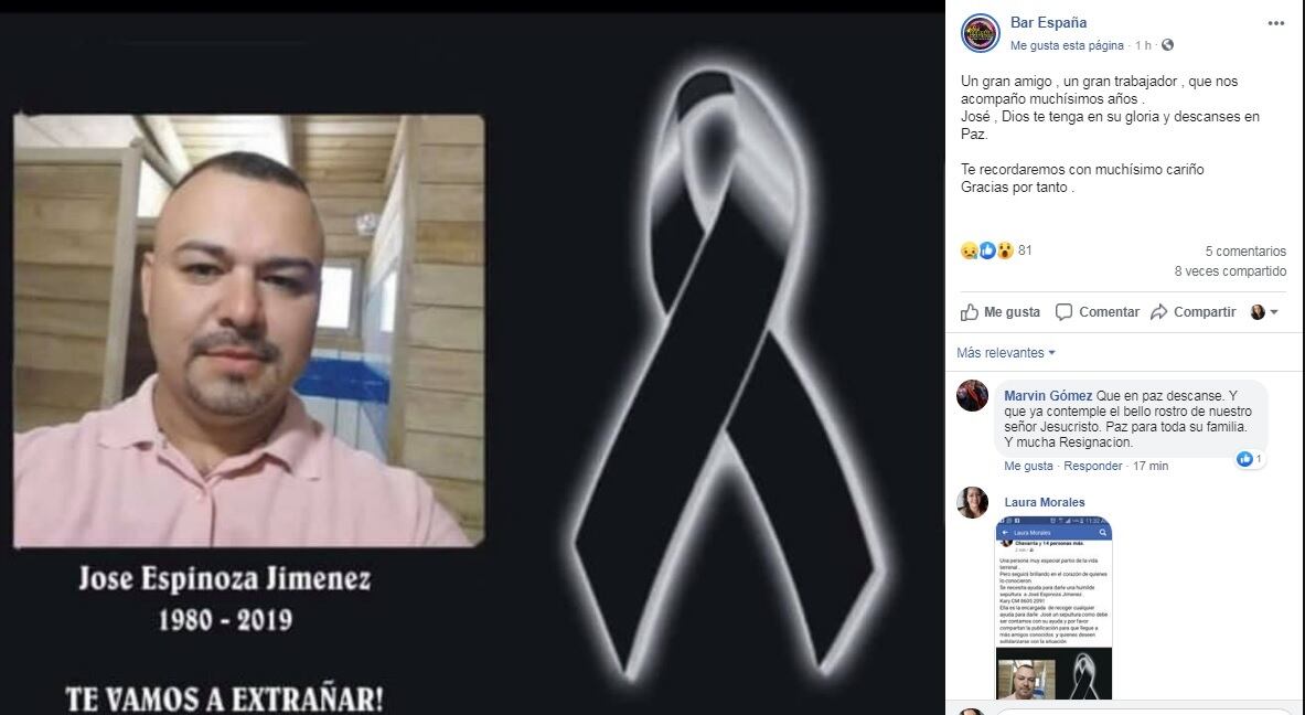 La amiga de Espinoza contó este sábado, mientras esperaba que le entregaran el cuerpo de José, que les está costando reunir el dinero para el funeral, por lo agradecen cualquier colaboración que las personas puedan darles. Si usted quiere ayudar puede comunicarse con Karina al teléfono 8605-2091.