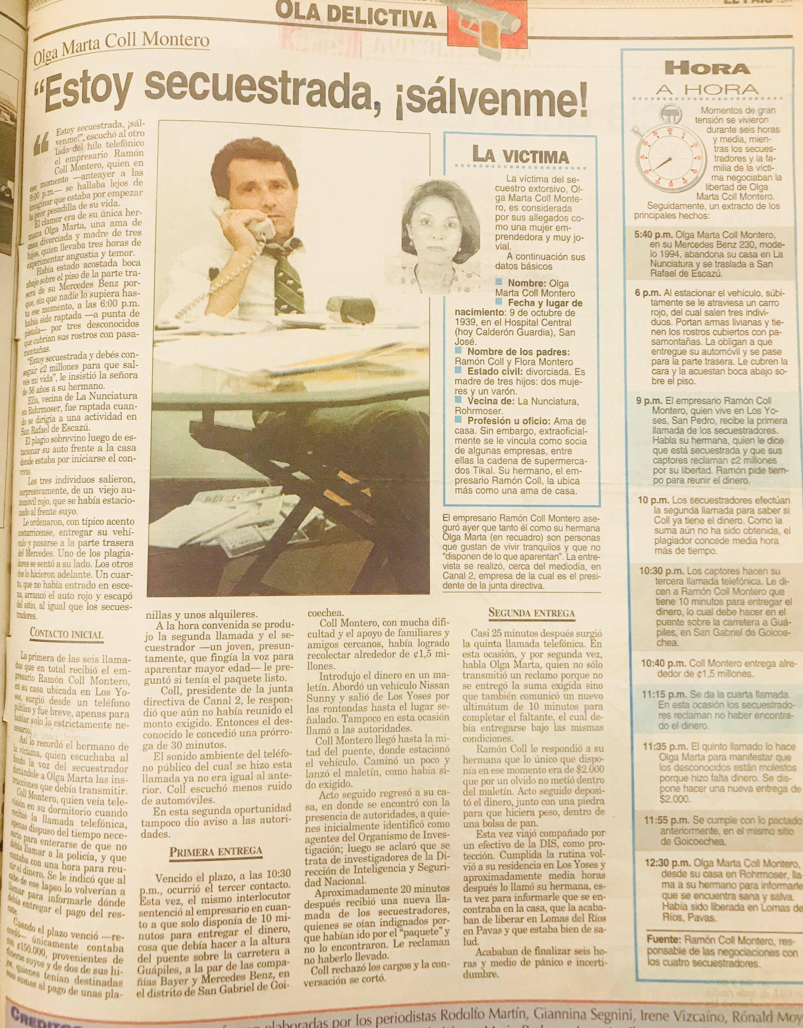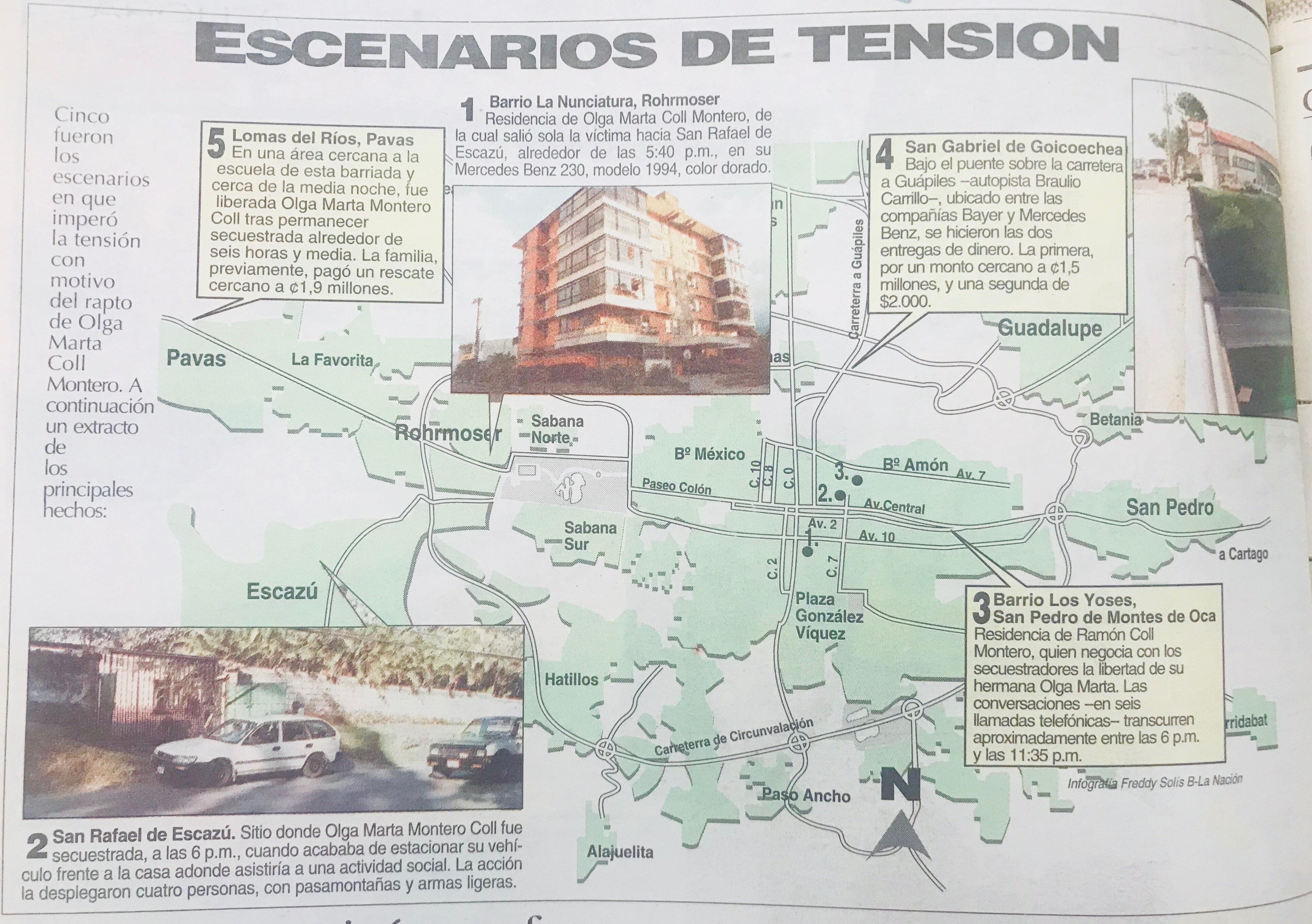 El día del rapto Olga Marta Coll había salido de su casa, ubicada en Rohrmoser, a las 5:40 p.m. Iba para la casa de una amiga a tomar té por las inmediaciones del Costa Rica Country Club, en San Rafael de Escazú.