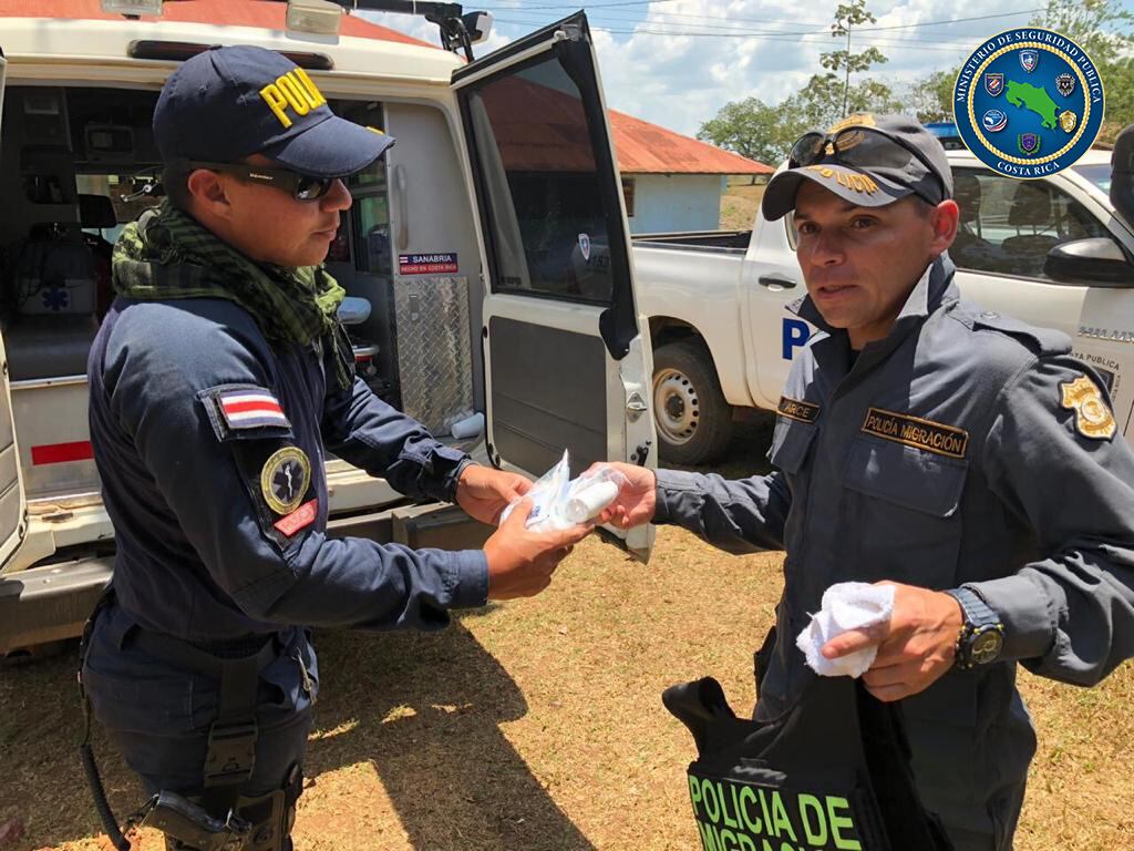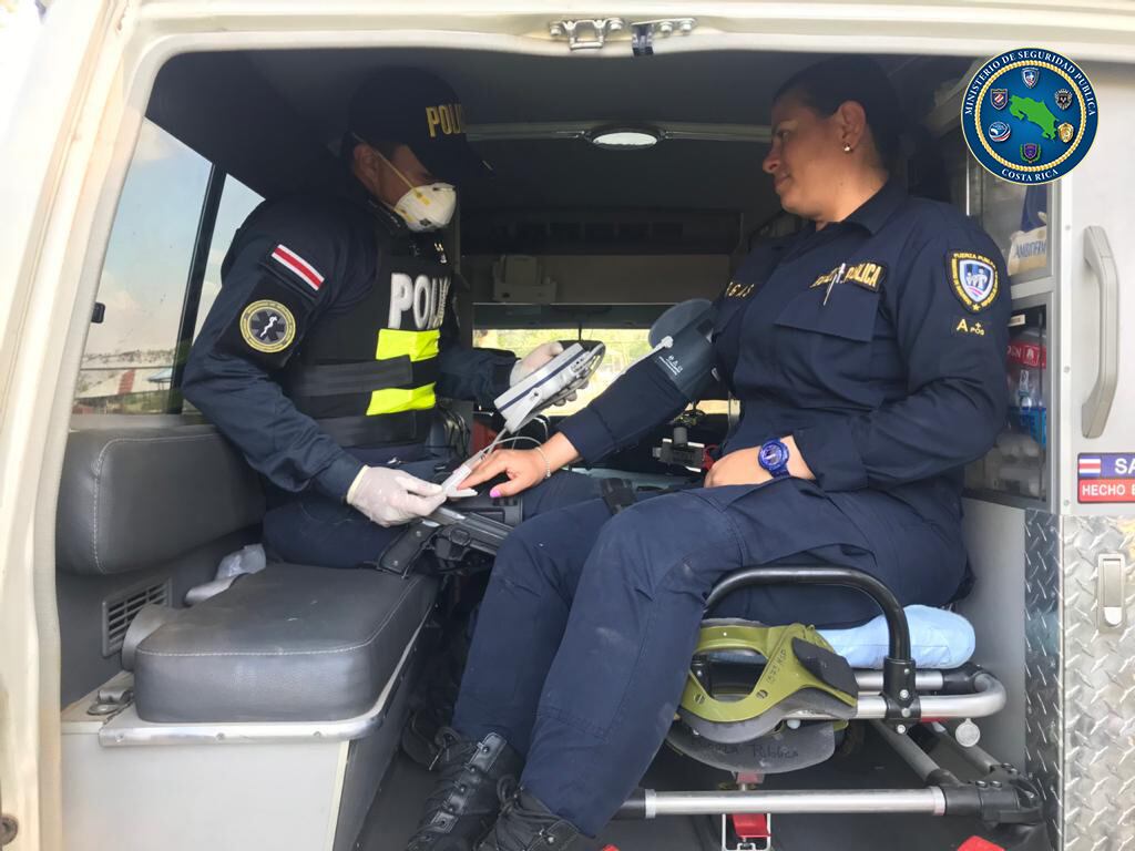 Con ellos anda una ambulancia del Ministerio de Seguridad Pública que cuenta con un técnico en emergencias médicas y un asistente de primeros auxilios, ellos son también dos agentes de la Fuerza Pública.