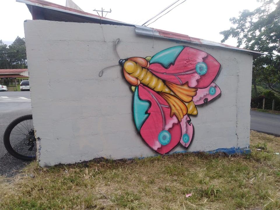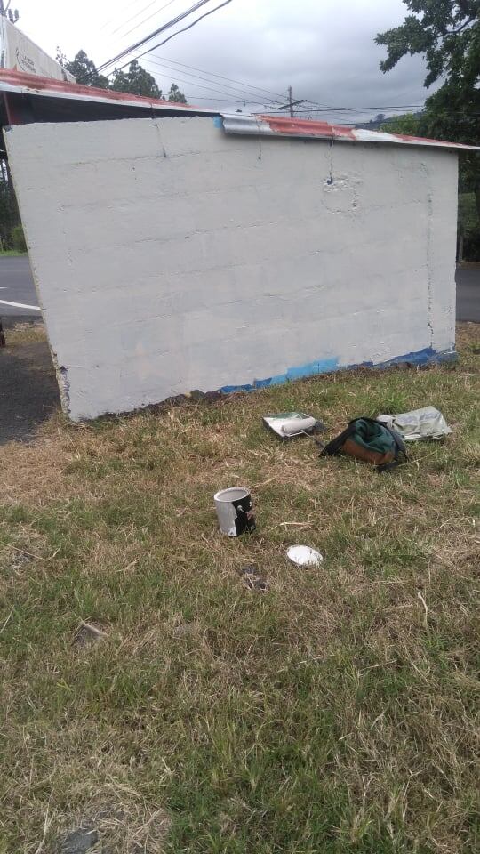 Alonso fue el martes 11 de agosto a la entrada de Urasca, a 200 metros de la represa, y en la pared de una parada de buses empezó a pintar. Nos contó que no todos los días pudo ir porque la lluvia no se lo permitió y tardó una semana en terminar la obra.