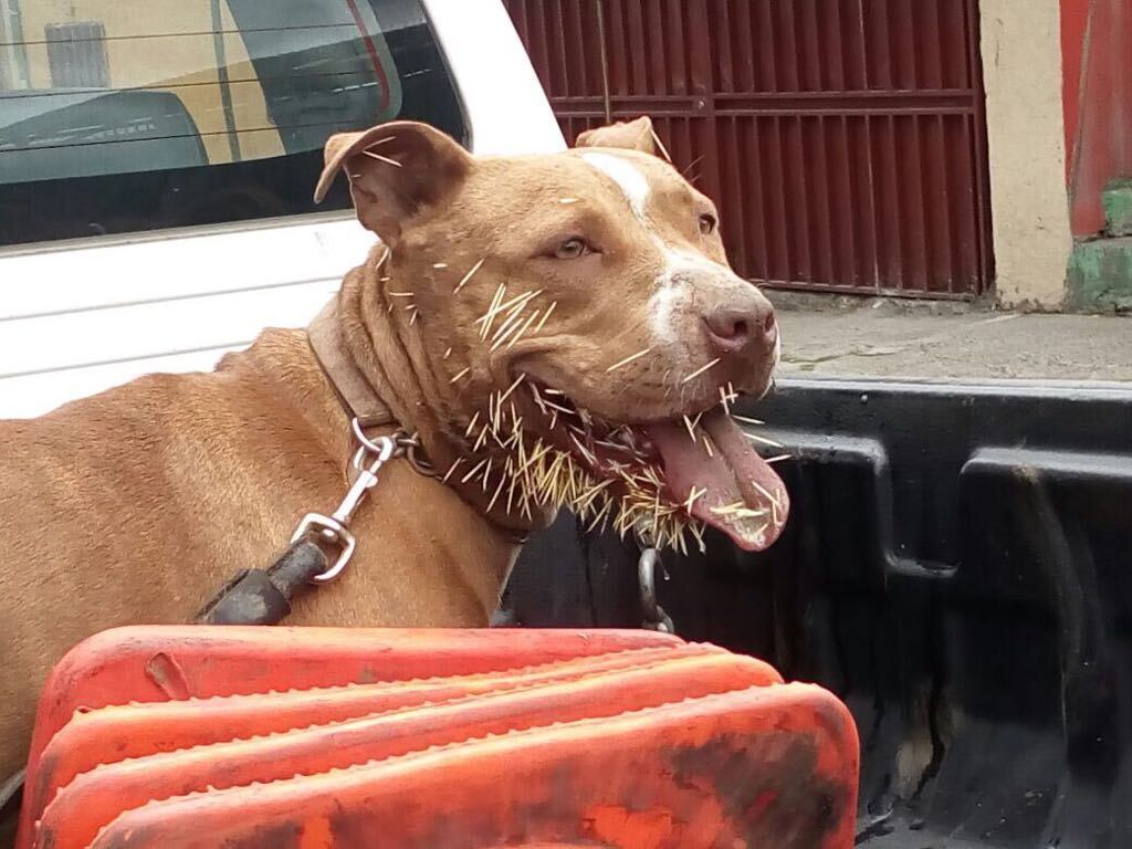 Un perro de raza American Stanford se recupera en una veterinaria de Desamparados después de que un puercoespín lo dejó con la cara llena de púas y mucho dolor.