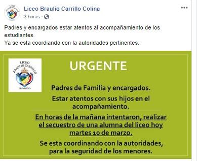 "En horas de la mañana intentaron realizar el secuestro de una alumna del liceo hoy martes 10 de marzo. Se está coordinando con las autoridades para la seguridad de los menores”.