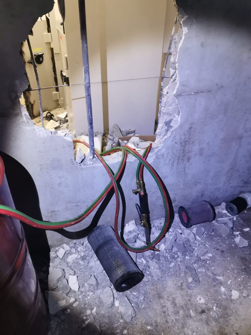 Los sospechosos utilizaron mazos y oxiacetilénica (oxígeno y acetileno) para cortar paredes y llevarse el cajero. Ellos dejaron el equipo tirado en el sitio.