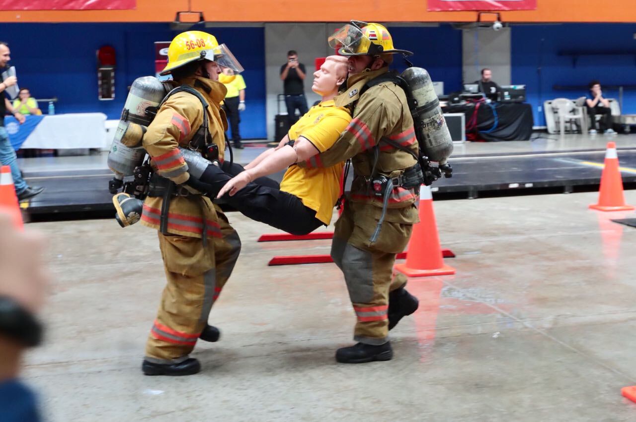 Entre las pruebas que tuvieron que afrontar los batallones estuvo la de controlar un incendio en un edificio, para esto se utilizó una torre de 55 escalones, a la cual tenían que subir los bomberos cargando mangueras y su respectivo equipo de aire.
