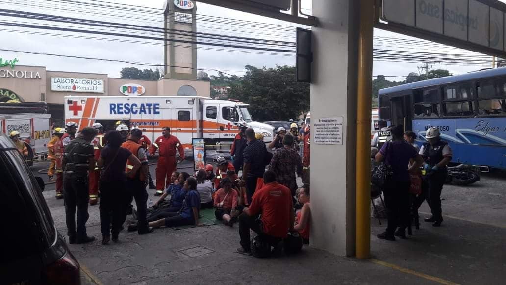 El vehículo quedó incrustado en el Buen Sabor tras el bombazo, dejando a 25 personas afectadas, de las cuales 7 fueron trasladadas a la clínica Carlos Durán y al hospital Calderón Guardia, según confirmó la Cruz Roja.