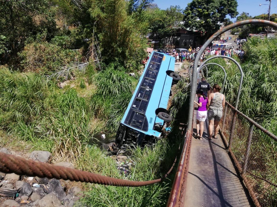 Un bus se quedó sin frenos, se salió de la calle y fue a dar a un río en Tuetal Norte de Alajuela.
