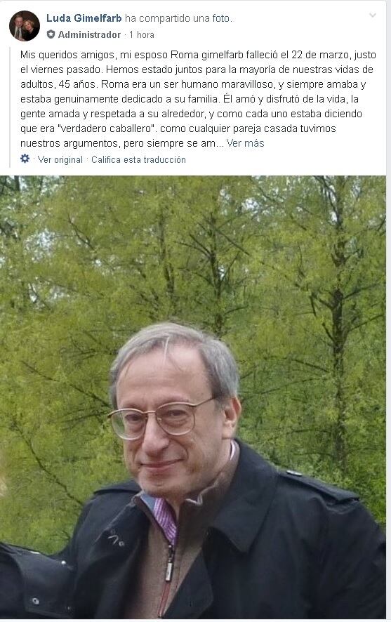 “Roma Gimelfarb falleció el 22 de marzo, justo el viernes pasado. Hemos estado juntos la mayoría de nuestras vidas, 45 años. Roma era un ser humano maravilloso, y siempre amoroso, estaba genuinamente dedicado a su familia. Él amó y disfrutó de la vida, era un verdadero caballero”, posteó la esposa.
