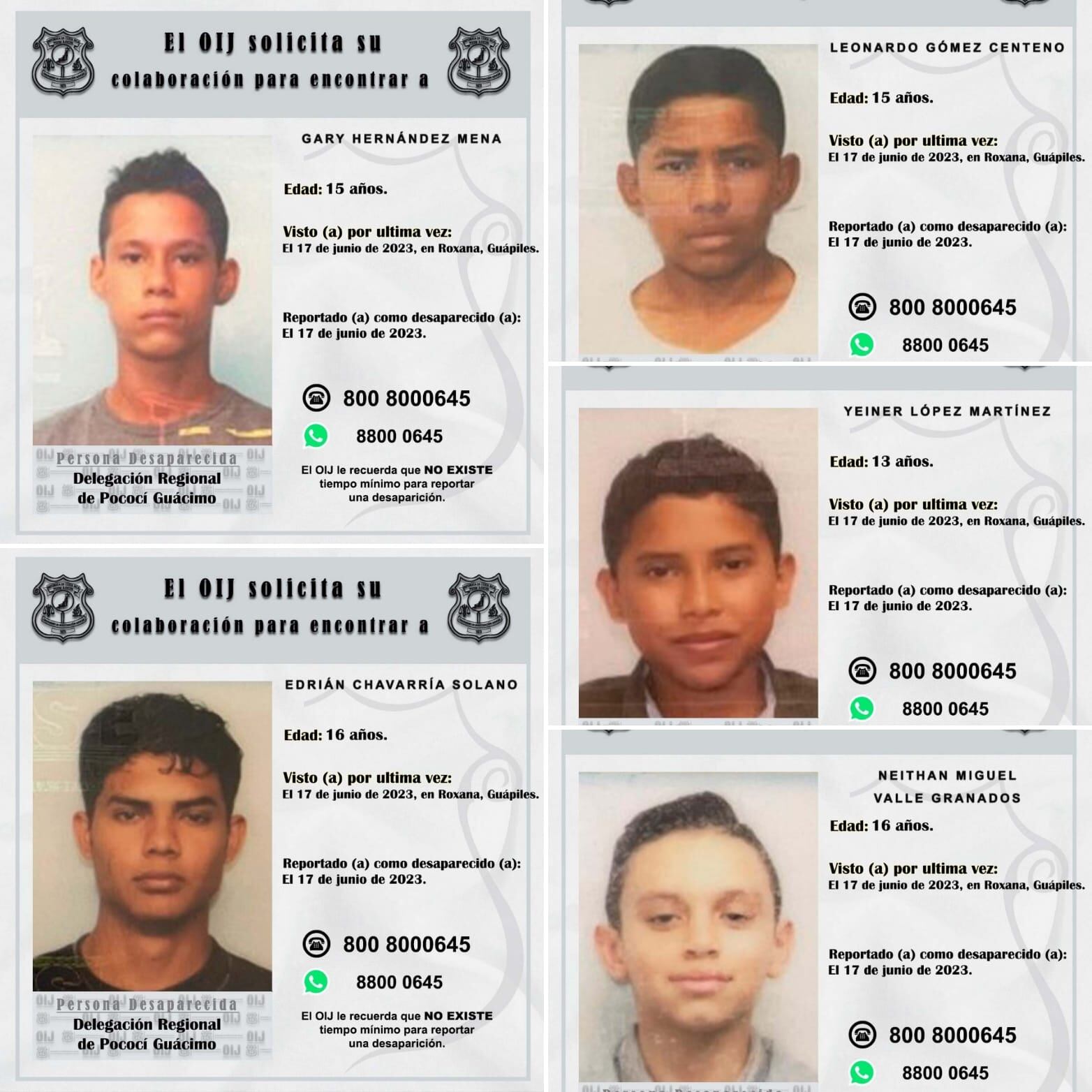 Estos menores de edad se llaman Gary Hernández Mena, de 15 años; Leonardo Gómez Centeno, de 15; Yeiner López Martínez, de 13; Edrián Chavarría Solano, de 16, y Neithan Miguel Valle Granados, de 16 años.