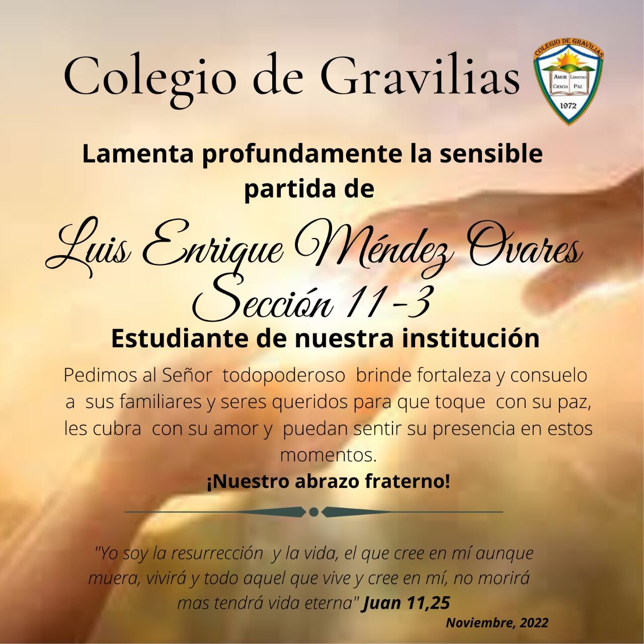 “La comunidad educativa del Colegio de Gravilias lamenta profundamente el fallecimiento de Méndez Ovares, estudiante de undécimo de nuestra institución. Nos unimos al dolor que embarga a la familia Méndez Ovares, a todos sus allegados y seres queridos”, postearon.