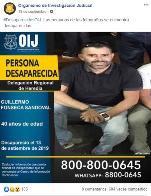 Solano señaló que, de momento, no tienen informes sobre dónde podría encontrarse Fonseca y agregó que lo último que saben es que debía tomar un bus de la empresa Tuasa en Heredia para ir a San José; pero las personas que lo esperaban nunca lo recibieron ni lo vieron, lo llamaron al celular y no contestó.