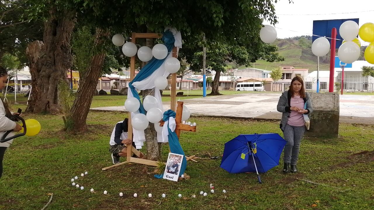 Los vecinos del niño Gael Ramírez Vargas, de 4 años, quien falleció la tarde del jueves al caerle un árbol en el parque de Los Sauces, en El Tejar de El Guarco, Cartago, hicieron una oración y un altarcito en ese sitio por el pequeño y su familia.