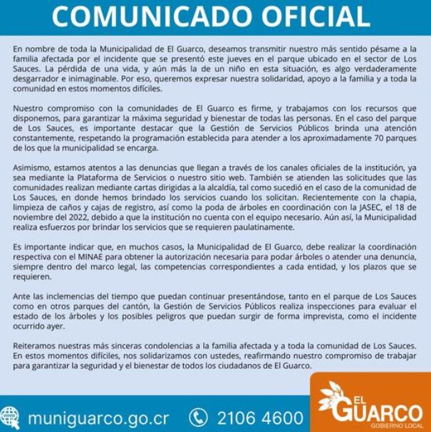 “Nuestro compromiso con la comunidad de El Guarco es firme y trabajamos con los recursos que disponemos para garantizar la máxima seguridad y bienestar de las personas. En el caso del parque Los Sauces es importante destacar que las Gestión de Servicios Públicos brinda atención constantemente, respetando la programación establecida para atender los 70 parques de los que la municipalidad se encarga”, dice parte del comunicado.