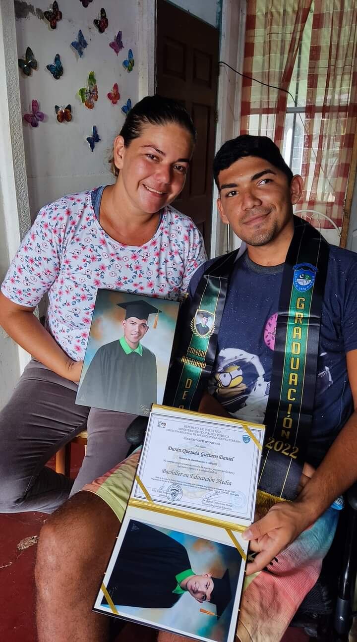 Él y su mamá son todo un ejemplo y, pese a que les ha tocado durísimo, no dejan de luchar. Él sacó el bachillerato el año pasado y su mamita, doña Noemy Gabriela Durán Quesada, también se fajó y ya va por noveno.