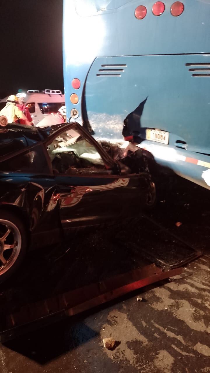 Una persona aún no identificada perdió la vida en un violento choque entre un carro y un bus.