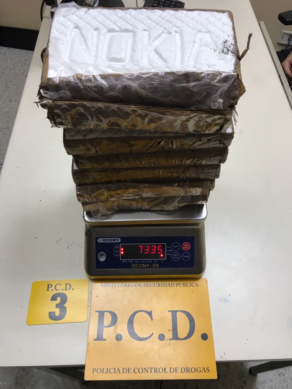 Las autoridades confirmaron que cargaba siete paquetes, para un total de poco más 7 kilos de cocaína, estos tenían un molde con la palabra "Nokia" los cuales fueron decomisados de inmediato.
