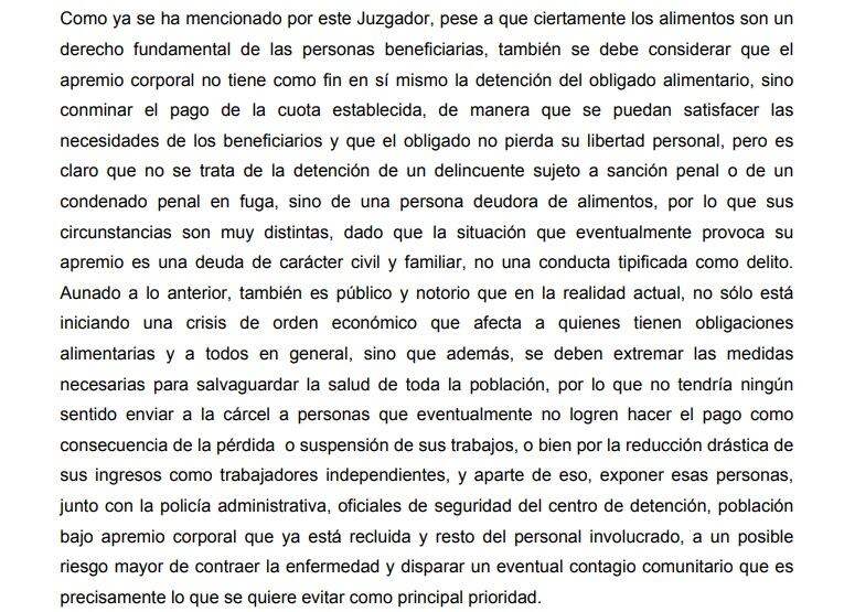“Se debe considerar que el apremio corporal no tiene como fin en sí mismo la detención del obligado alimentario, sino conminar (advertir) el pago de la cuota establecida, de manera que se puedan satisfacer las necesidades de los beneficiarios y que el obligado no pierda su libertad personal”, dice el fallo.