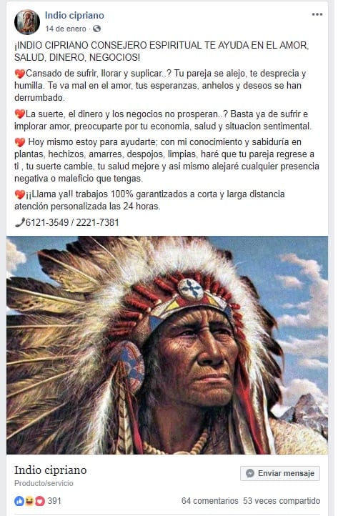 El Indio promociona su negocio en una página de Facebook y según los posteos él usa su sabiduría por medios de plantas para hacer hechizos, amarres, despojos y limpias para cumplir la voluntad de sus clientes.