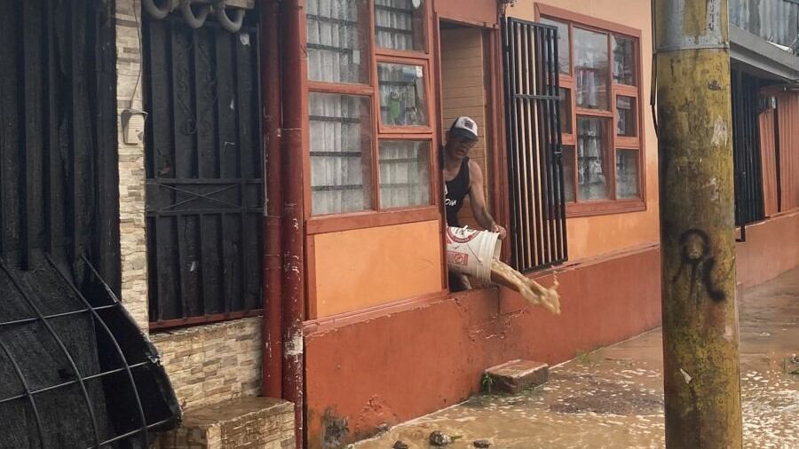 Mientras sacaba el agua con baldes de su casa, Mora nos contó que en 24 horas vivieron dos emergencias porque el río se desbordó.