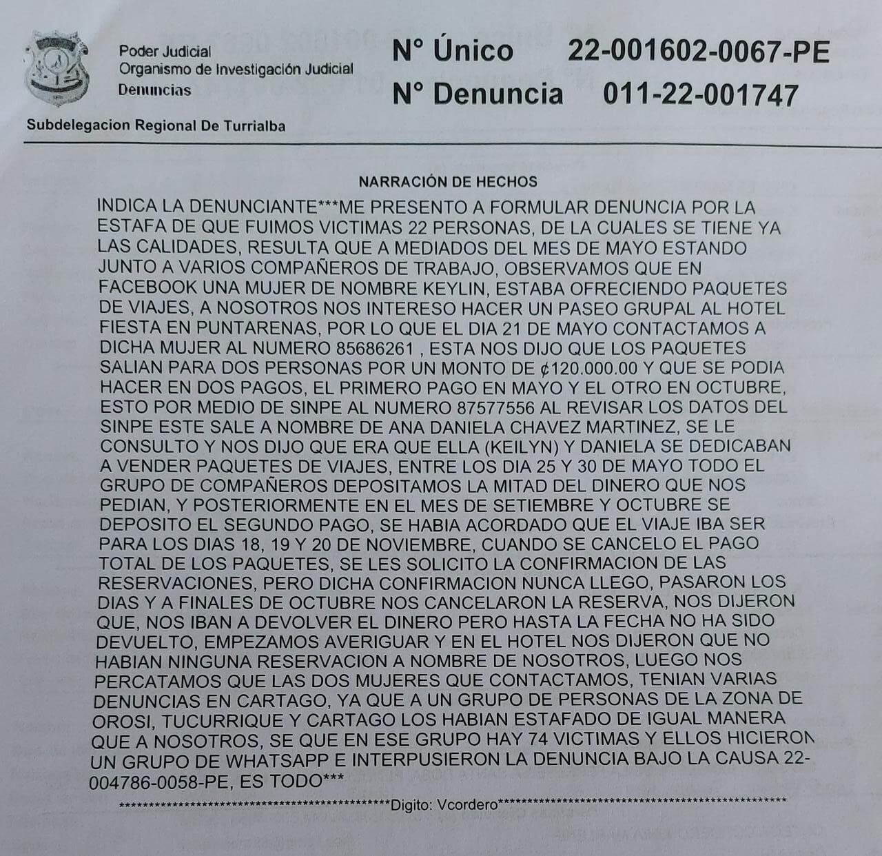 “A mediados del mes de mayo con mis compañeros de trabajo observamos que una mujer ofrece paquetes de viajes y a nosotros nos interesó hacer un viaje grupal al hotel Fiesta en Puntarenas”, detalla la denuncia colectiva 22-001602′0067-PE