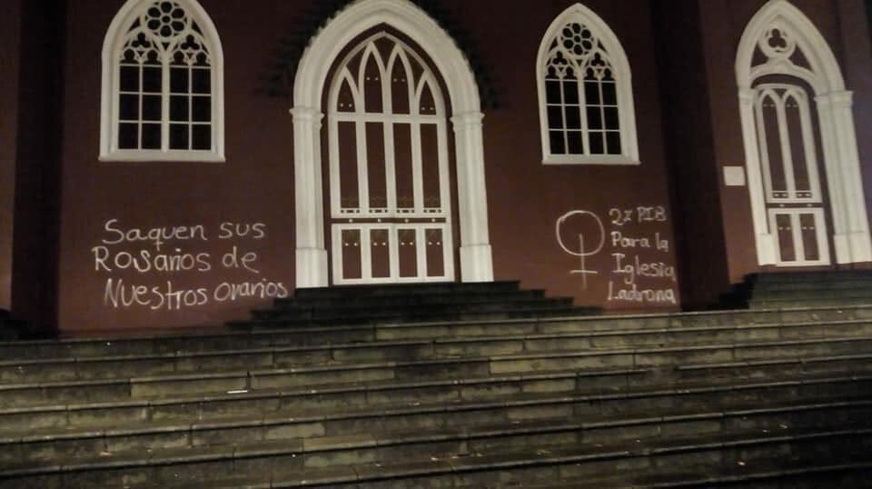 Los antisociales escribieron mensajes de protesta sobre la violencia contra las mujeres. Entre los escritos estaban frases como “saquen sus rosarios de nuestros ovarios” y “2% del PIB (producto interno bruto) para la iglesia ladrona”.