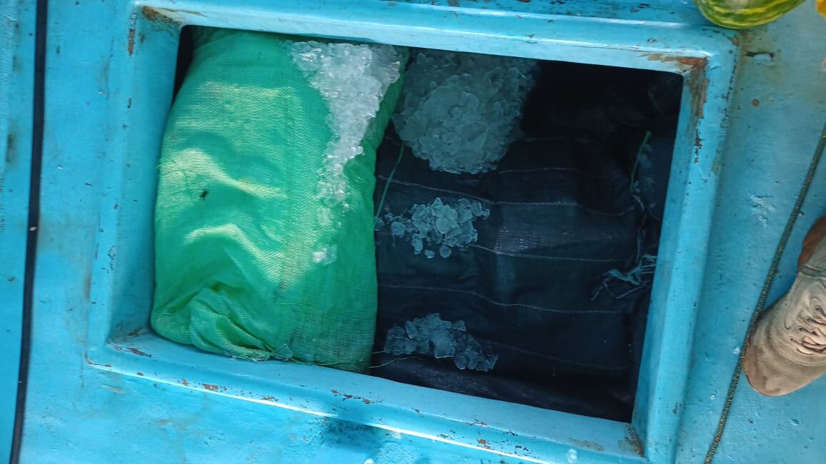 Tres pescadores fueron detenidos como sospechosos de transportar un cargamento de 722 paquetes de cocaína, los cuales llevaban escondidos dentro de la hielera de la lancha.