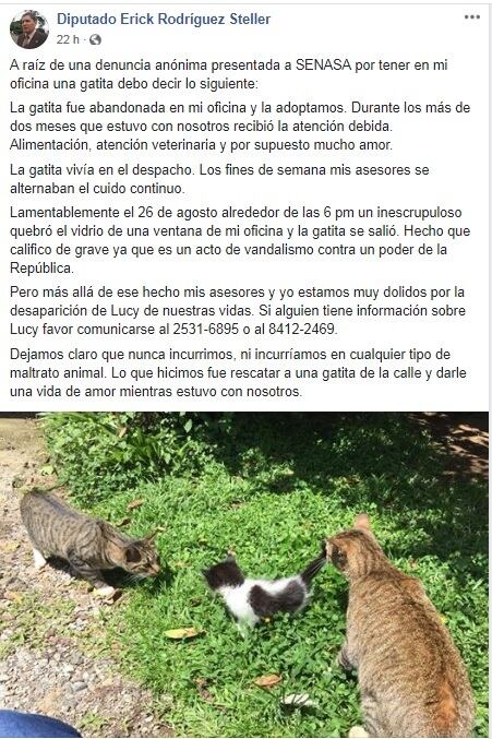 El diputado independiente Erick Rodríguez Steller está desesperado por encontrar a Lucy, la gatica que había adoptado hace casi tres meses.