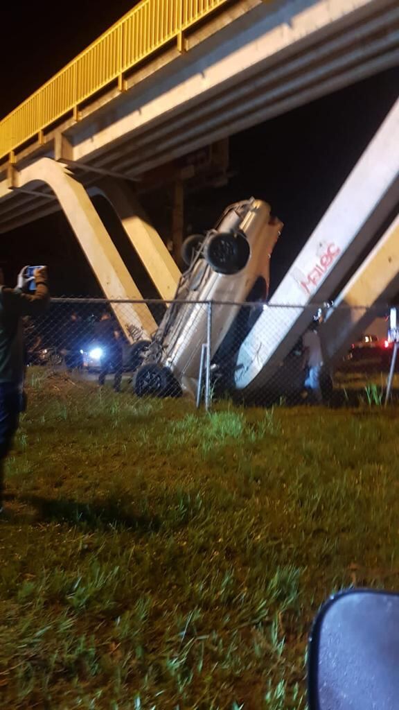 El carro en que viajaba su hijo con cuatro amigos chocó contra la base del puente peatonal, el accidente fue tan violento que el carro quedó en posición vertical, la parte delantera del carro quedó destrozada contra el piso, mientras que el techo quedó recostado en la base del puente.