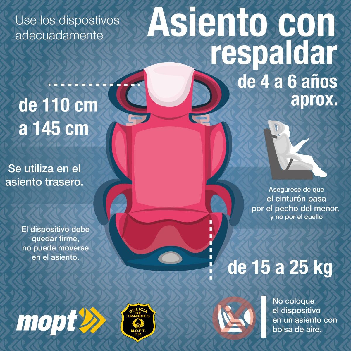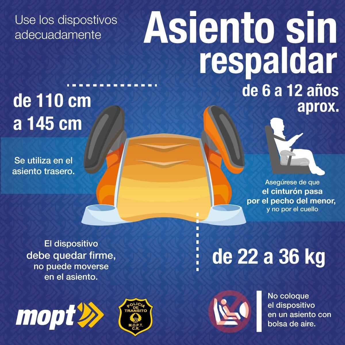Si no sabe cómo está el asunto con las sillas tome en cuenta que todo niño de menos de 12 años y de menos de 145 cm de talla deben viajar en un dispositivo de retención, sea portabebé, silla, búster con respaldar o búster sin respaldar.