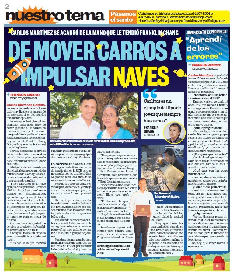 La compañía Ad Astra Rocket, presidida por el astronauta Franklin Chang Díaz y en la que se perfecciona el motor de plasma, llora la muerte de Carlos Alberto Martínez, de 30 años.