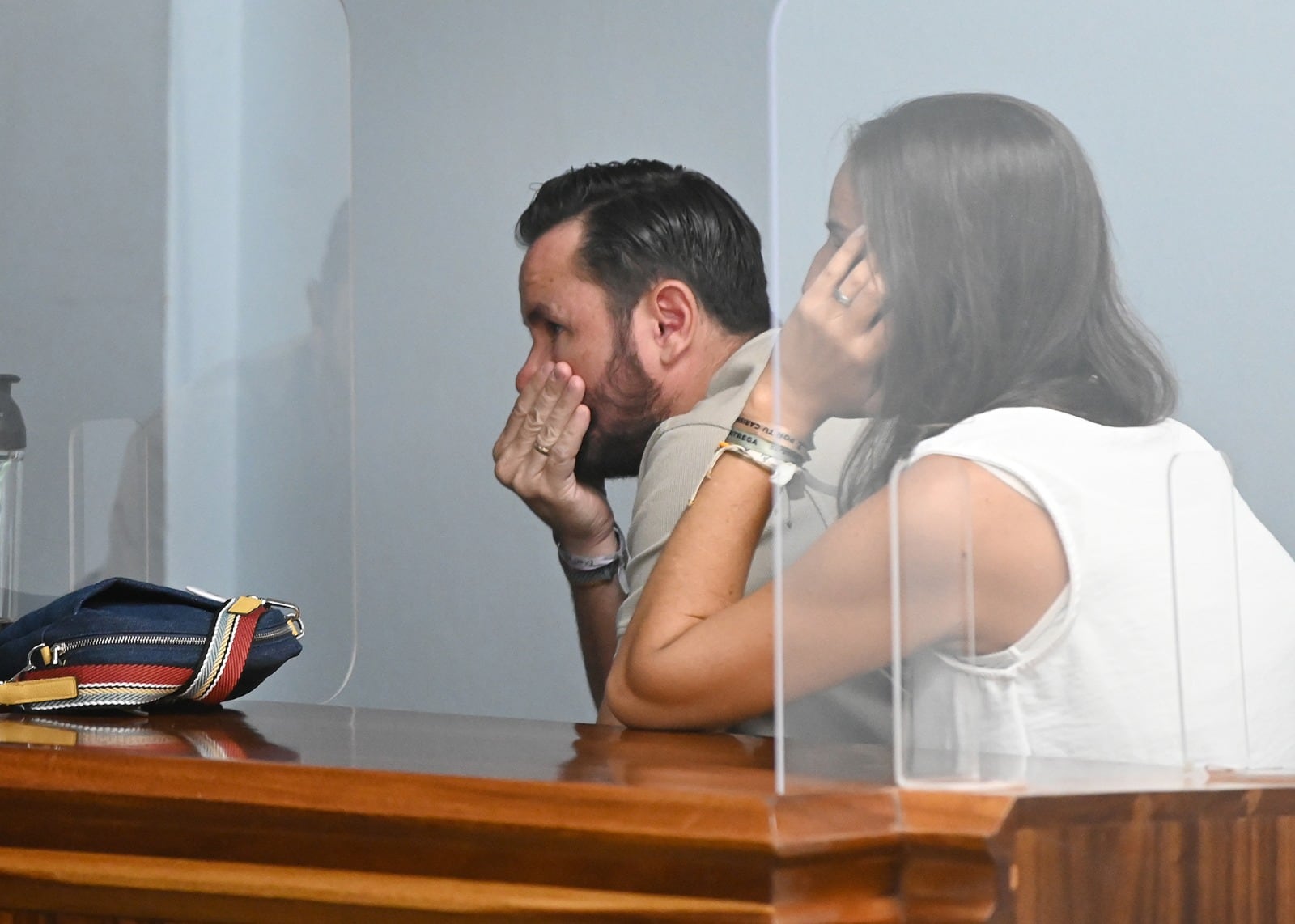 La otra mano la sostenía su esposo Mario, quien tomaba agua y veía hacia arriba, igual se agarraba la cara.