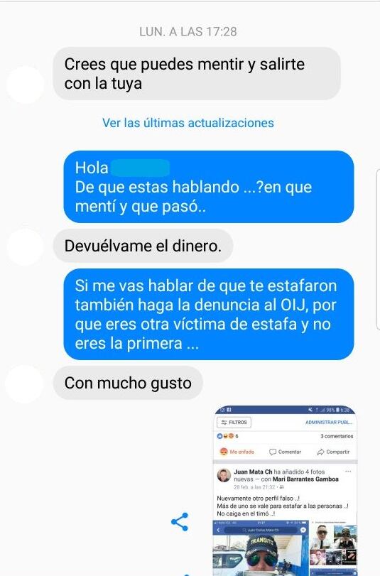 Mata explicó que en estos meses se ha dado cuenta de que entre 10 y 15 personas han sido estafadas con los perfiles falsos hechos a su nombre en lugares como Puntarenas, Corredores, Limón y Guanacaste, pero no descarta que la cantidad sea mayor.