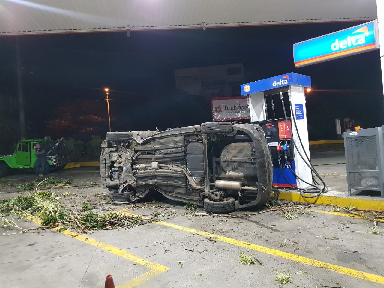 El carro se salió de la carretera, pegó contra unos tubos que están a la par de cada máquina dispensadora y que sostienen los extintores y después golpeó la máquina y se volcó.