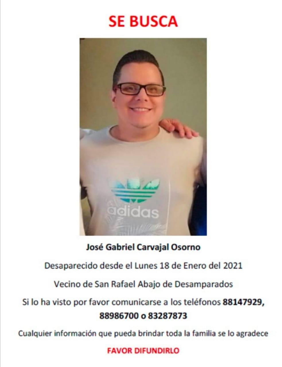 Una familia de San Rafael Abajo de Desamparados pide ayuda para encontrar a José Gabriel Carvajal Osorno, de 28 años, quien está desaparecido desde el lunes 18 de enero.