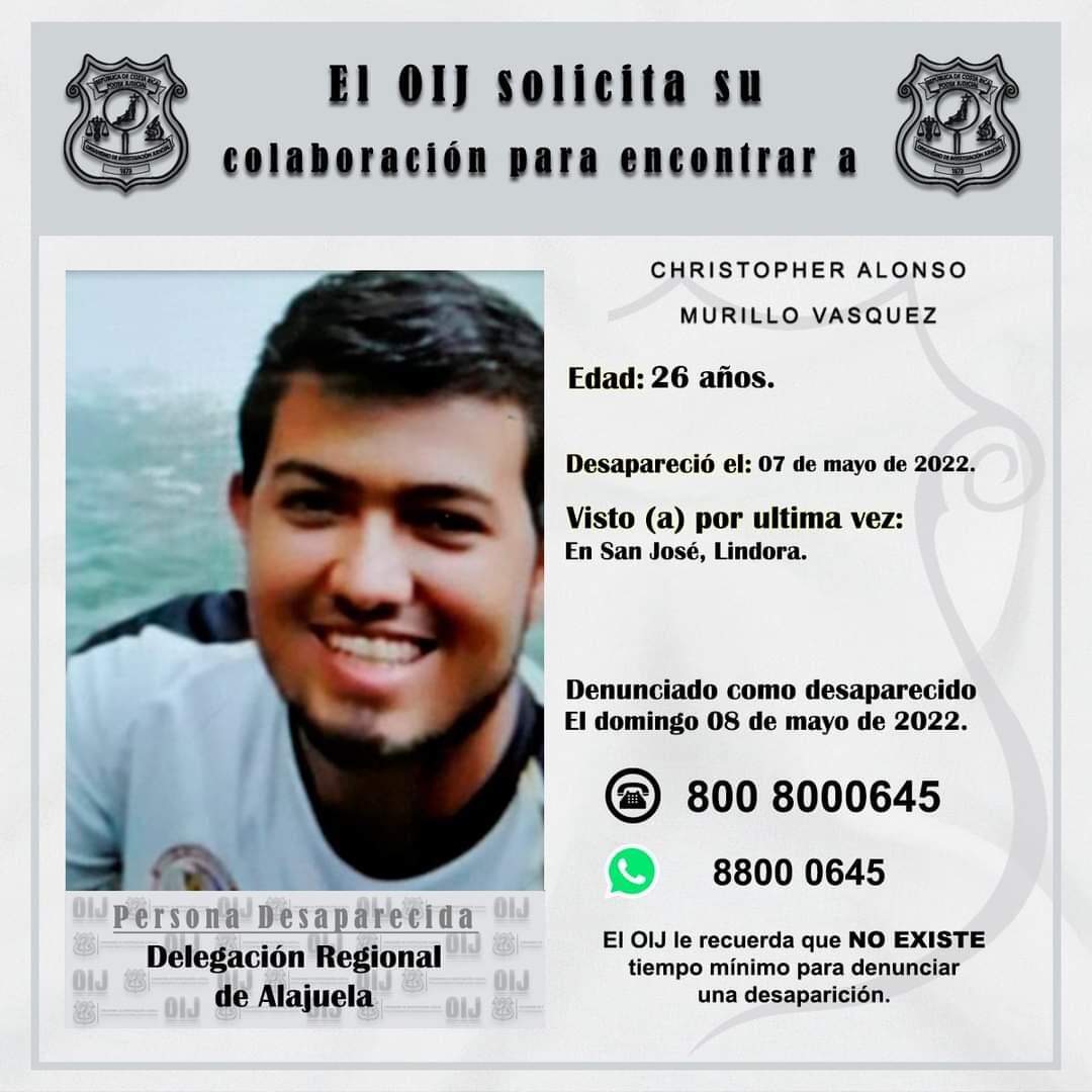 Murillo es vecino de Alajuela, vive con sus papás y sus hermanas. Según sus amigos es un joven muy trabajador y responsable por lo que se sienten preocupados, su teléfono celular se le había descargado el día que desapareció cuando llegó al bar.