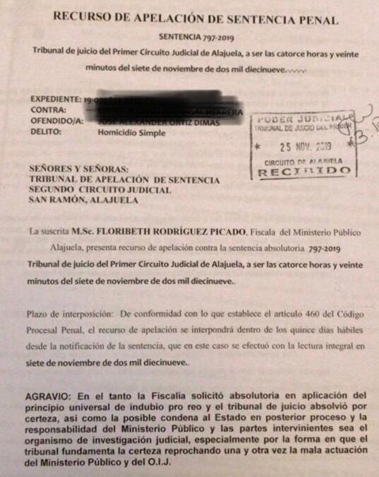 En el documento, del cual La Teja tiene una copia, dice: “Agravio: En el tanto la Fiscalía solicitó absolutoria en aplicación del principio universal de indubio pro reo y el tribunal de juicio absolvió por certeza, así como la posible condena al Estado en posterior proceso y la responsabilidad del Ministerio Público y las partes intervinientes sea el Organismo de Investigación Judicial, especialmente por la forma en que el tribunal fundamenta la certeza y reprochando una y otra vez la mala actuación del Ministerio Público”.